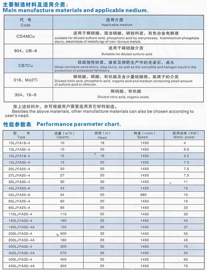 概述: LJYA系列料漿泵為單級(jí)單吸立式懸臂式離心液下泵。葉輪為半開(kāi)式,葉輪前后均配有耐磨蓋,廣泛應(yīng)用于化工流程輸送含30%以下固體顆粒,粘度低于200CP的磨、腐蝕交互作用的介質(zhì)。特別適用于磷肥工業(yè)中輸送磷酸、磷銨料漿等介質(zhì)。 輸送介質(zhì)-般低于110℃。如需輸送更高溫度的介質(zhì),應(yīng)考慮用冷卻水冷卻軸承。 性能范圍:流量Q=1O~400m3/h 揚(yáng)程H=50m