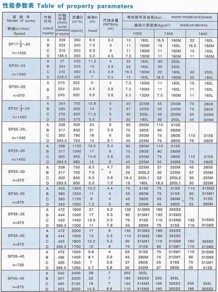 SP 性能范圍: 流量:Q 可達(dá)7000m3/h 揚(yáng)程:H 可達(dá)25m 工作壓力:P 可達(dá)0MPa 工作溫度:t -20~+120℃ 應(yīng)用: *化工流程中強(qiáng)制循環(huán) *海水養(yǎng)殖 *城市煤氣工程 *水處理系統(tǒng):總之,本系列泵能夠經(jīng)濟(jì)有效地輸送大流量,低揚(yáng)程,均勻地或含有-定顆粒的,化學(xué)中性的,或有腐蝕性的液體。 特點(diǎn): *泵效率高,能耗小。 *泵在整個(gè)性能范圍內(nèi)的能耗均勻,可以在閉閥下啟動(dòng),而電機(jī)不致過(guò)載。 *過(guò)流截面大,不易堵塞。 *結(jié)構(gòu)堅(jiān)固,壽命長(zhǎng)。