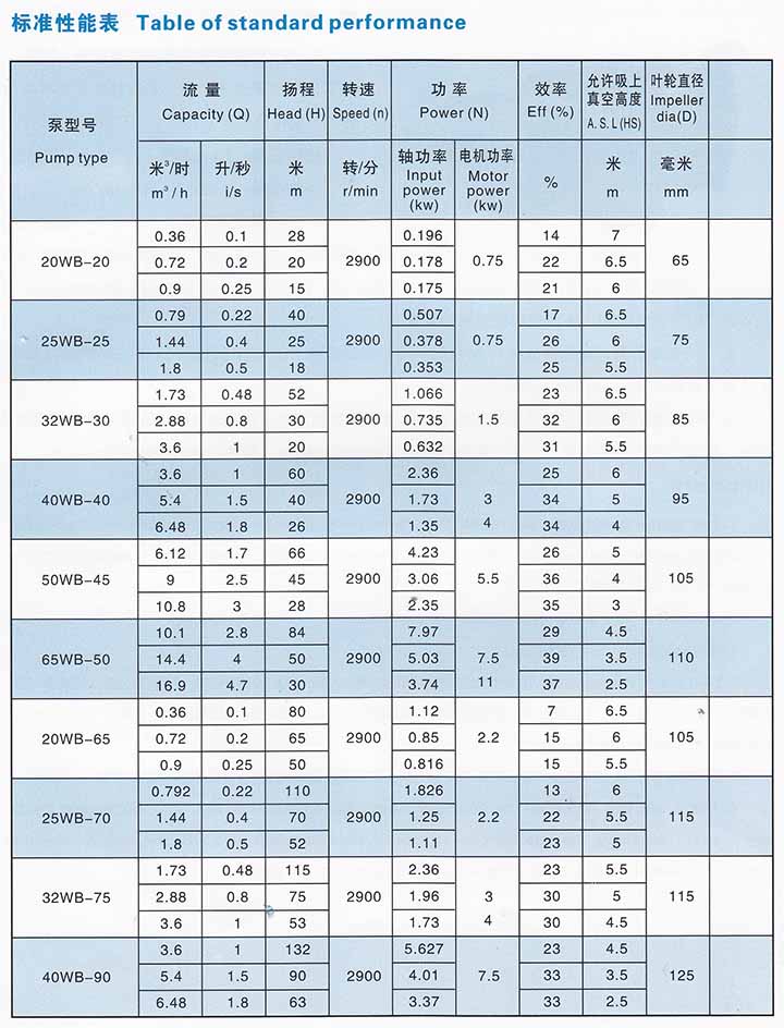 概述: 1、WB型旋渦泵用于輸送溫度從-20℃~80℃,粘度不大于5°E,無(wú)腐蝕性和具有腐蝕 性的無(wú)固體顆粒的液體。 揚(yáng)程范圍:15~132米。 流量范圍:0.36m3/h~16.9m3/h。 2、WB型旋渦泵共有十種型號(hào):具體為20WB-20、25WB-25、32WB-30、40WB-40、WB-20、25WB-25、32WB-30、40WB-40、50WB-45、65WB-50、20WB-65、25WB-70、32WB-75、40WB-90。皆為單級(jí)懸臂式旋渦泵。 3、WB型旋渦泵過(guò)流部分的材料為HT20-40、鋁鑄鐵和1Cr18Ni9Ti、1Cr18Ni12Mo2Ti四種(分別用材料代號(hào)H、J、B和M表示)。 4、WB型旋渦泵的密封形式有軟填料密封和單端面機(jī)械密封。除WB和WM型泵用單端面機(jī)械密封外,泵出廠時(shí)一律裝軟填料密封。如用戶(hù)需要其他形式的軸封,要在訂貨時(shí)說(shuō)明。