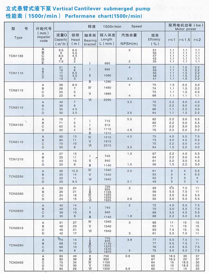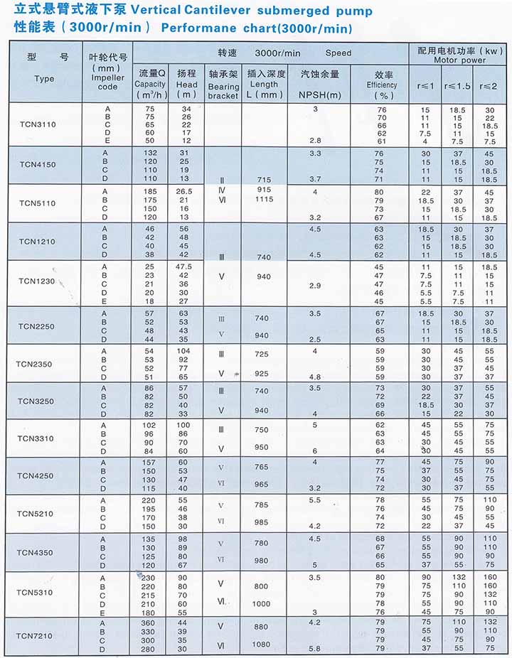 概述: TCN型泵是立式、單級、單吸、懸臂式液下泵,用圓柱管聯(lián)結(jié)泵的水力部件和底座。出液管同圓柱管分開,不用采取軸封措施,泵在液下部位不設(shè)軸承,可以輸送含有固體顆粒的介質(zhì)。根據(jù)介質(zhì)中固體顆粒的大小和性質(zhì)不同,泵葉輪又分為兩種型式,即閉式葉輪(TCN型)加開式葉輪(TCF型)當(dāng)介質(zhì)含顆粒較多而尺寸較大時,選用開式葉輪。泵的插入深度根據(jù)電機(jī)極數(shù),所配用軸承架的規(guī)格大小可以在700~1800mm范圍內(nèi)變化。當(dāng)需要時,泵可以配帶吸入管。 流量Q:5-400m3/h 揚(yáng)程H:2.5-110m 溫度t:-20℃~+200℃ 用途: 化工、石油化工、采礦、造紙業(yè)、水泥廠、煉鋼廠、自來水廠、食品等行業(yè)。 輸送各種無機(jī)酸和有機(jī)酸,各種堿性溶液、磷復(fù)肥裝置的料漿。 水力特性: 可以根據(jù)泵輸送介質(zhì)的性質(zhì)和運(yùn)行條件選擇泵體和葉輪的型式。葉輪可供選擇的型式