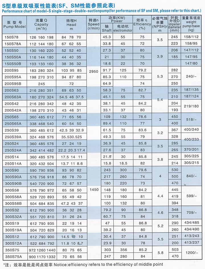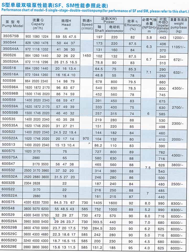 概述: S水平中開泵與其它同類型的泵相比較具有壽命長、效率高、結(jié)構(gòu)合理,運(yùn)行成本低、安裝及維修方便等特點(diǎn),是消防、空調(diào)、化工、水處理及其它行業(yè)的理想用泵。 泵體: 泵體的設(shè)計壓力為1.6MPa和2.0MPa。為滿足世界范圍用戶的不同要求,相應(yīng)的泵體進(jìn)出口法蘭可按ANSI、PN及JIS等標(biāo)準(zhǔn)選取。泵體的進(jìn)出口法蘭均位于下泵體,這樣可以在不拆卸系統(tǒng)管路的情況下取出轉(zhuǎn)子,維修方便。部分泵體采用雙流道設(shè)計,以減少徑向力,從而延長機(jī)封和軸承的壽命。 葉輪: 葉輪的水力設(shè)計采用了CFD技術(shù)。因此提高了S泵的水力效率。對葉輪進(jìn)行動平衡,確保S泵的運(yùn)行平穩(wěn)。 軸: 軸徑較粗,軸承間距較短,從而減小了軸的撓度,延長了機(jī)械密封和軸承的壽命。 軸套: 對于所有的S泵,軸套可以采用多種不同的材料,以防止軸被腐蝕和磨損,軸套可更換。 磨損壞: 泵體與葉輪間采用可更換的磨損環(huán),防止泵體和葉輪的磨損,更換方便,維修費(fèi)用低,同時保證運(yùn)行間隙和較高的工作效率。 填料體: 獨(dú)特的填料體設(shè)計既可以使用填料也可以使用機(jī)械密封,可以在不折卸泵蓋的情況下更換密封裝置。 軸承: 獨(dú)特的軸承體設(shè)計使軸承可采用油脂或稀油潤滑,軸承的設(shè)計壽命10萬小時以上,也可使用雙列推力軸承和封閉軸承。 材料: 根據(jù)用戶的實際需要,S水平中開泵的材料可為銅、鑄鐵、球鐵、316不銹鋼、416不銹鋼、雙向鋼、哈氏合金、蒙耐合金,鈦合金及20號合金等材料。 安裝方式: S型泵有兩種安裝方式一水平安裝和立式安裝,立式安裝可以減少占地面積。